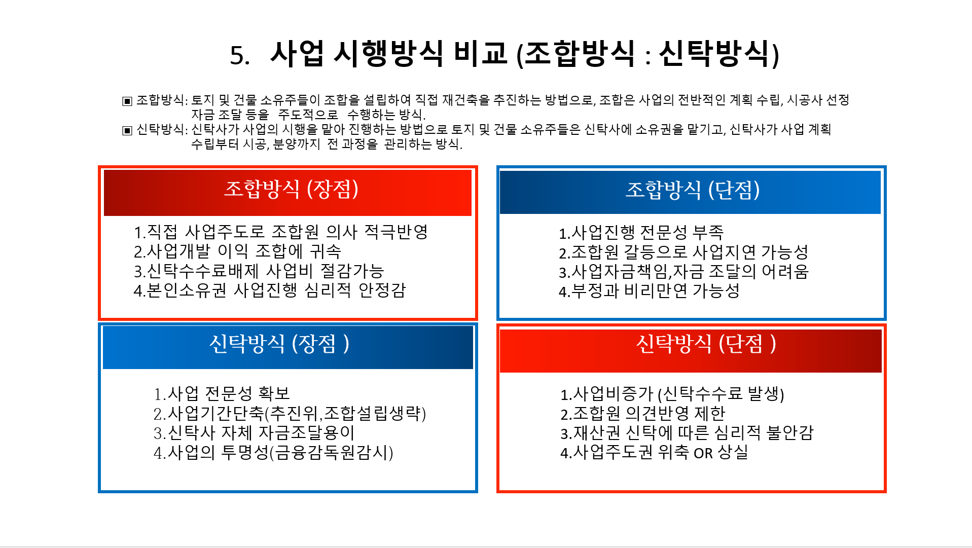 | 단점 | 하락기에 분담금 증가 | 시공사의 사업 지연 가능성 | 추가분담금 예측 어려움 |